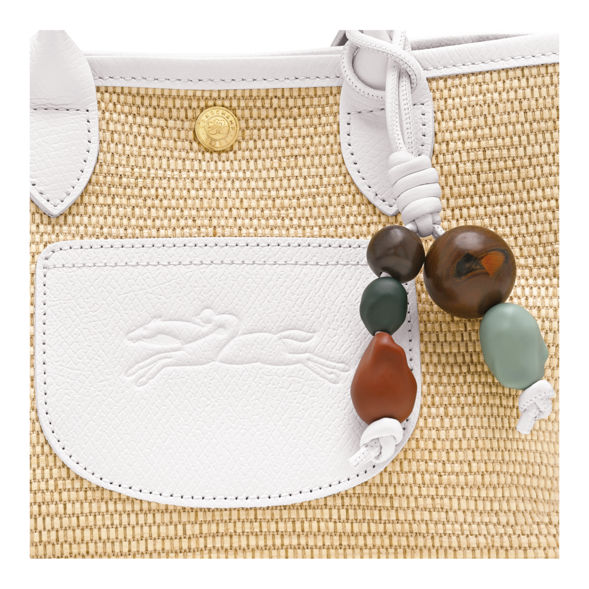 This small Panier Pliage is adorned with a beaded bag charm reminiscent of ceramic sculptures. The rounded, organic shapes of the beads add an artisanal touch. The cowhide leather handle, pouch, and trim elegantly contrast with the straw-effect canvas.