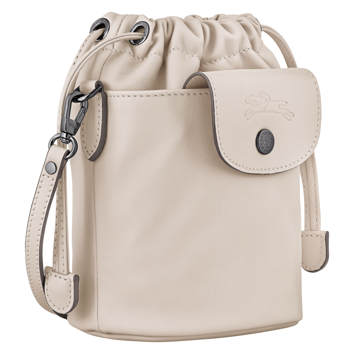 Le Pliage Xtra is reimagined as a compact bucket bag made of cowhide leather, combining practicality and versatility. Thanks to its adjustable strap, it can be worn crossbody or over the shoulder. It also features a front pocket, perfect for slipping in cards or other accessories. Its drawstring closure ensures optimal security.