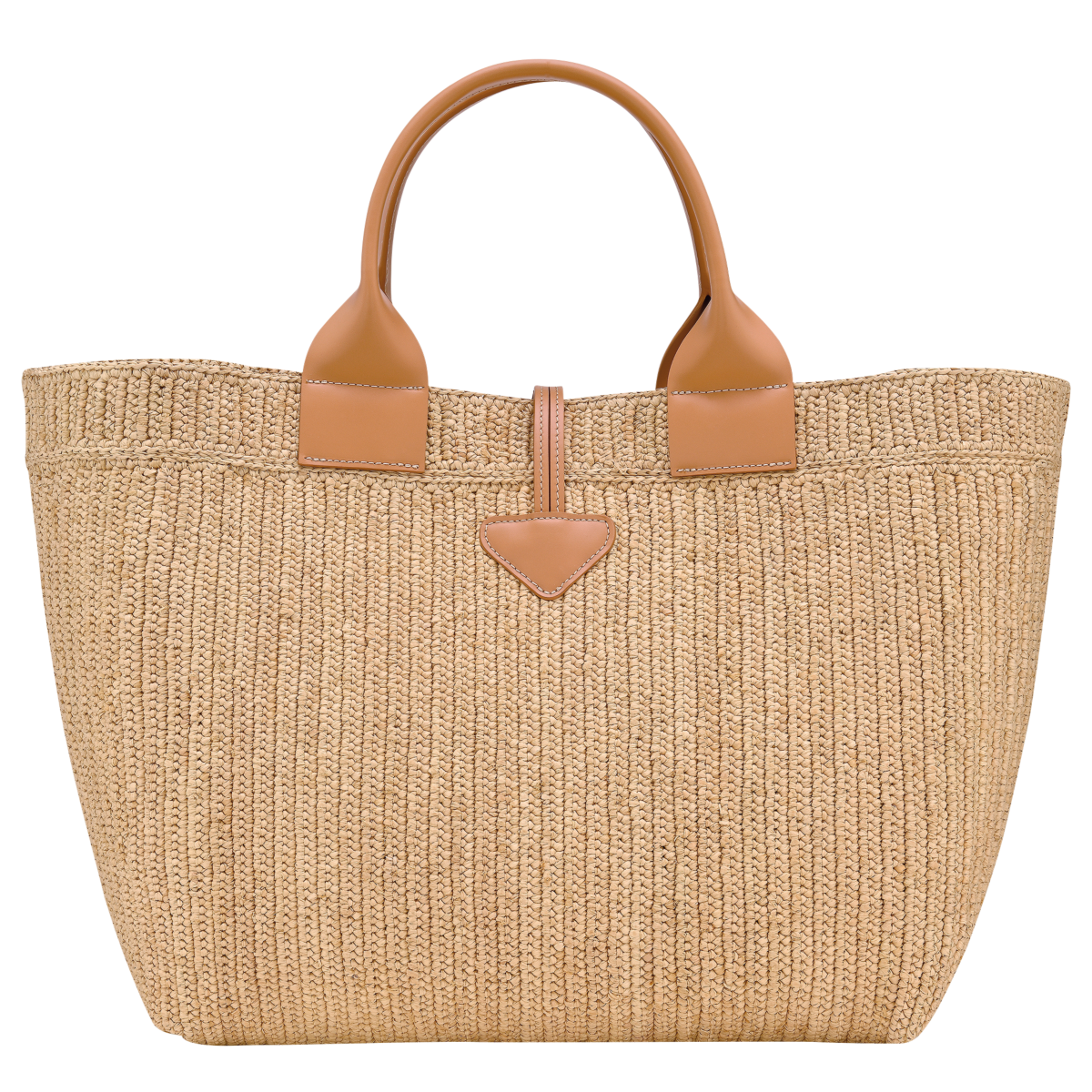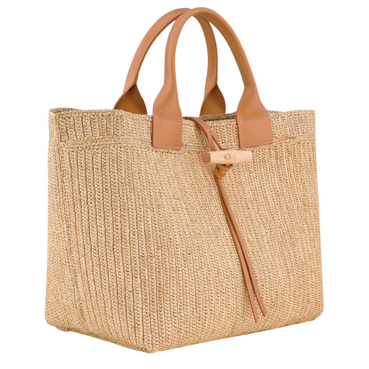 This large Le Roseau tote is a true testament to craftsmanship, created in collaboration with Anaka, an NGO supporting artisans in Madagascar. Handcrafted from raffia using traditional crochet techniques, it is woven as a single piece and finished with calfskin leather trim and vegetal-toned leather handles featuring visible stitching. The signature bamboo clasp—carved from raw maple wood and tied with a leather cord—adds a natural, distinctive touch. Inside, a cowhide leather tag embossed with the seasonal Longchamp logo completes this unique, summery design, blending authenticity, elegance, and purpose.